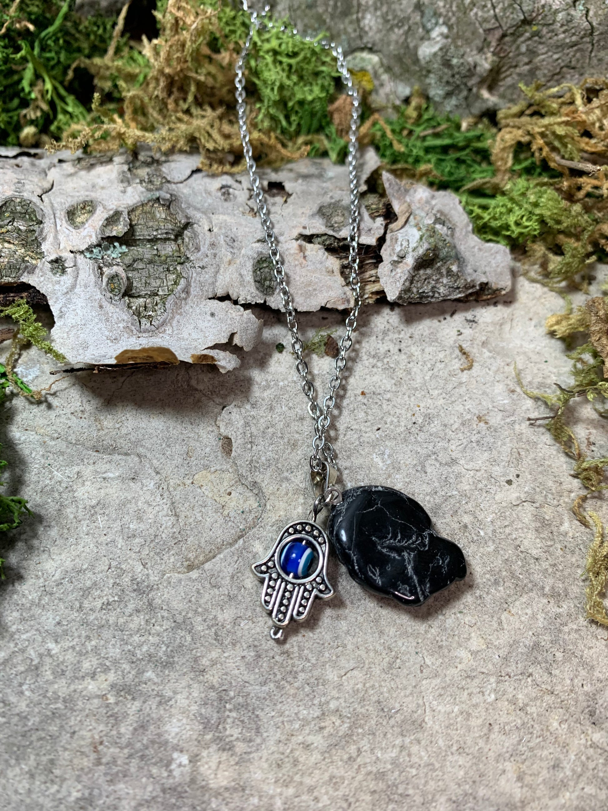 Black Obsidian Pendant with Metal Hamsa Hand with Evil Eye Charm 18"