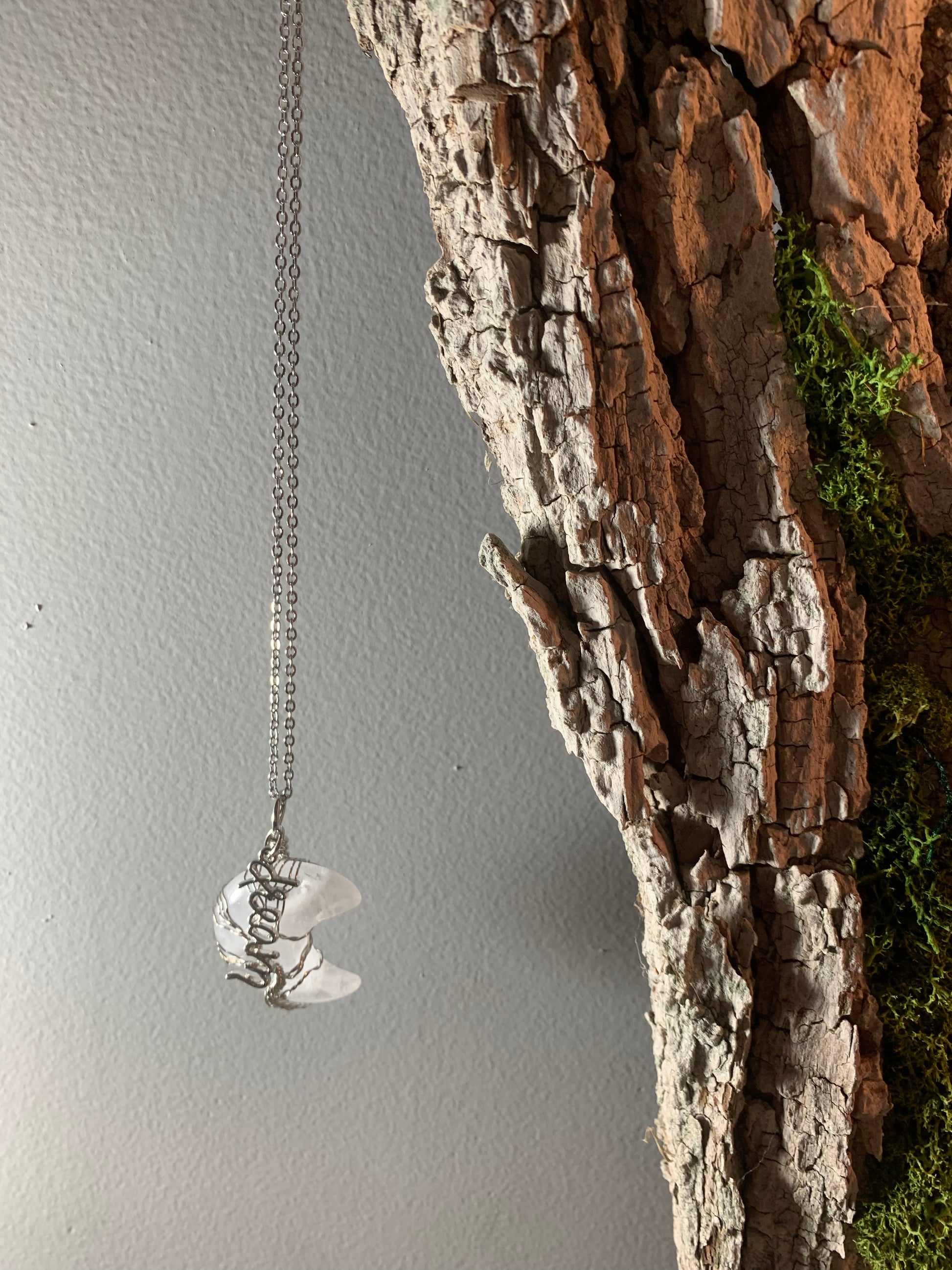 Clear Quartz Moon Pendant with Wire Tree of Life and Metal Dream Charm 26"